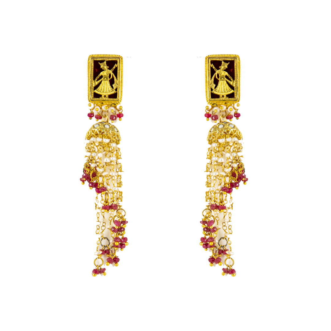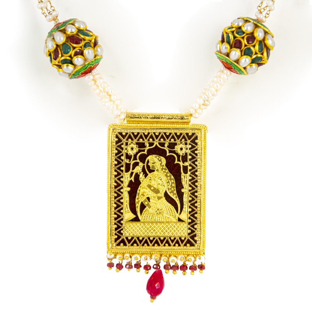 Thewa jewellery, 23 K Gold Thewa carved with hands, framed in pure 925 silver case, with 3 micron thick, gold plating. Real thewa in centre beading with real culured pearls. Looks magnificent as a wedding wear, contemporary outfit also.