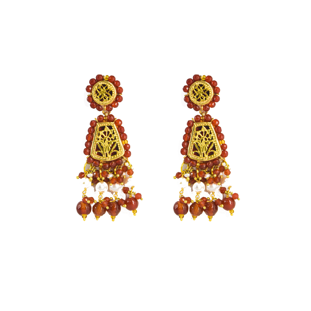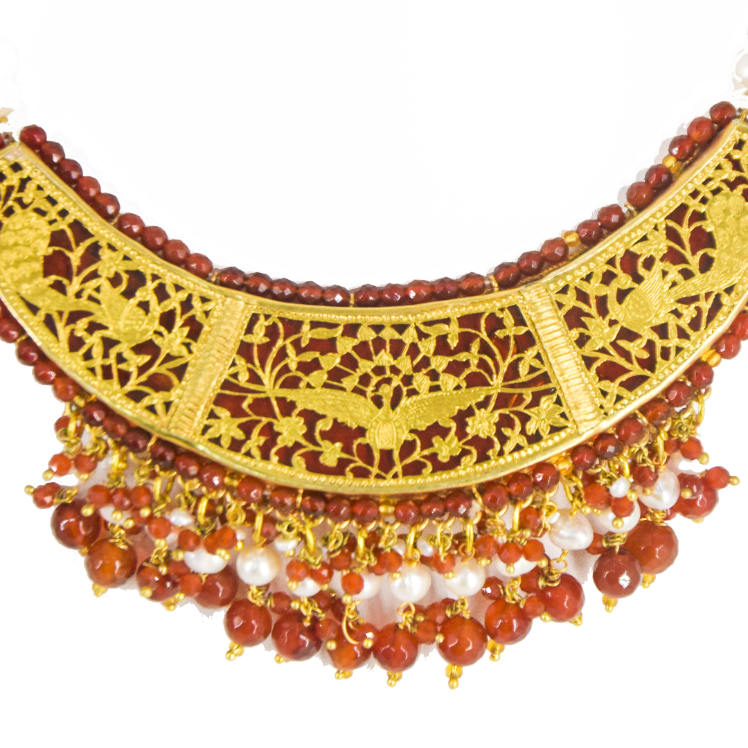 Thewa jewellery, 23 K Gold Thewa carved with hands, framed in pure 925 silver case, with 3 micron thick, gold plating. Real thewa in centre with real red onyx beads. Looks magnificent as a wedding wear, contemporary outfit also.