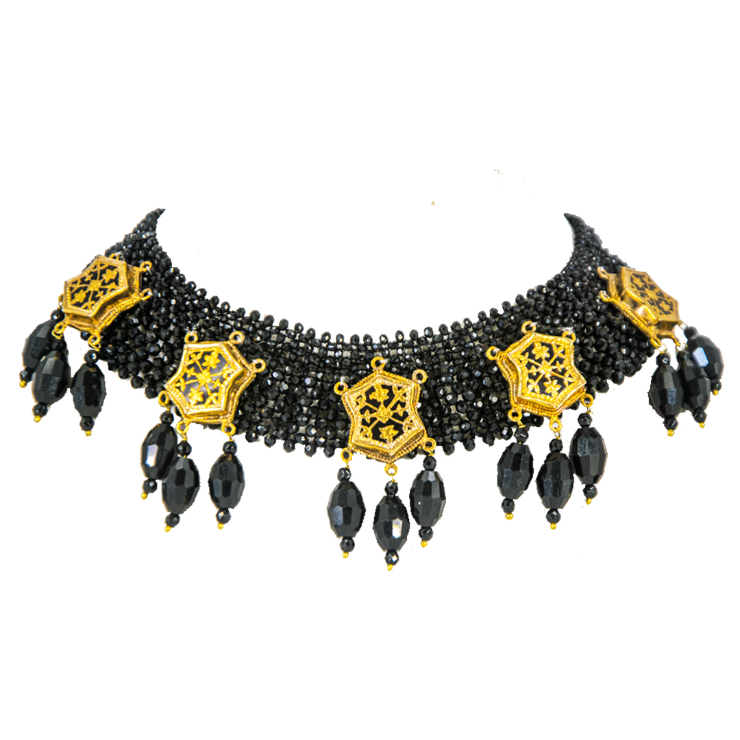 Thewa jewellery ,23 K Gold Thewa carved with hands, framed in pure 925 silver case, with 3 micron thick ,gold plating .Real thewa in centre beading with real gem stones, Black Onyx. Looks magnificent as a wedding wear, contemporary outfit also.