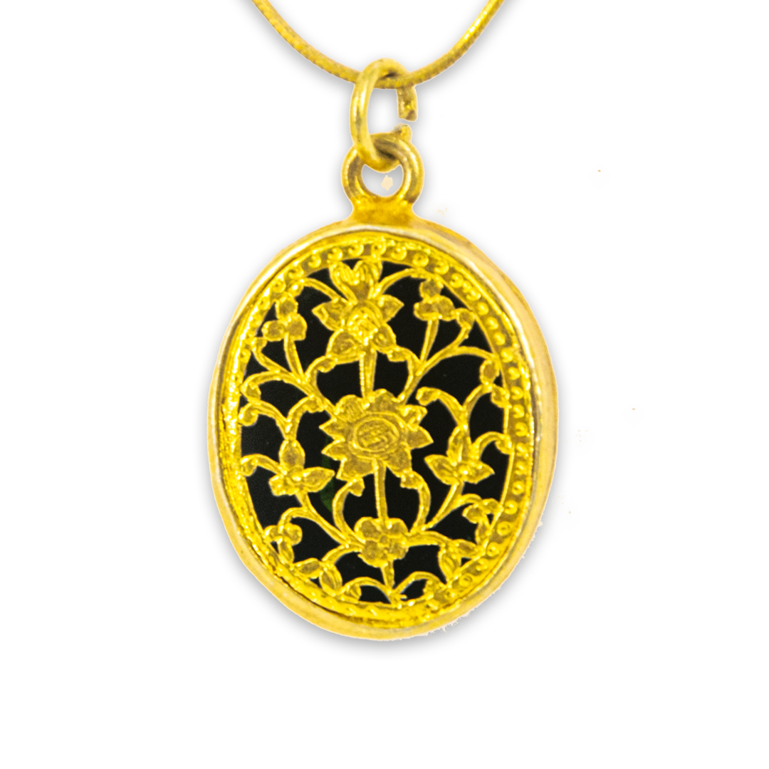 Thewa jewellery Pandent in 23 K Gold Foil carved with hands , fused with glass, framed in silver case gold plated. silver Hook Chain. Looks magnificent as a wedding gift.