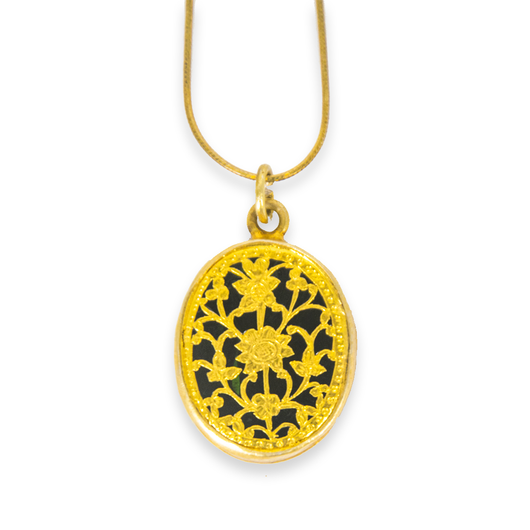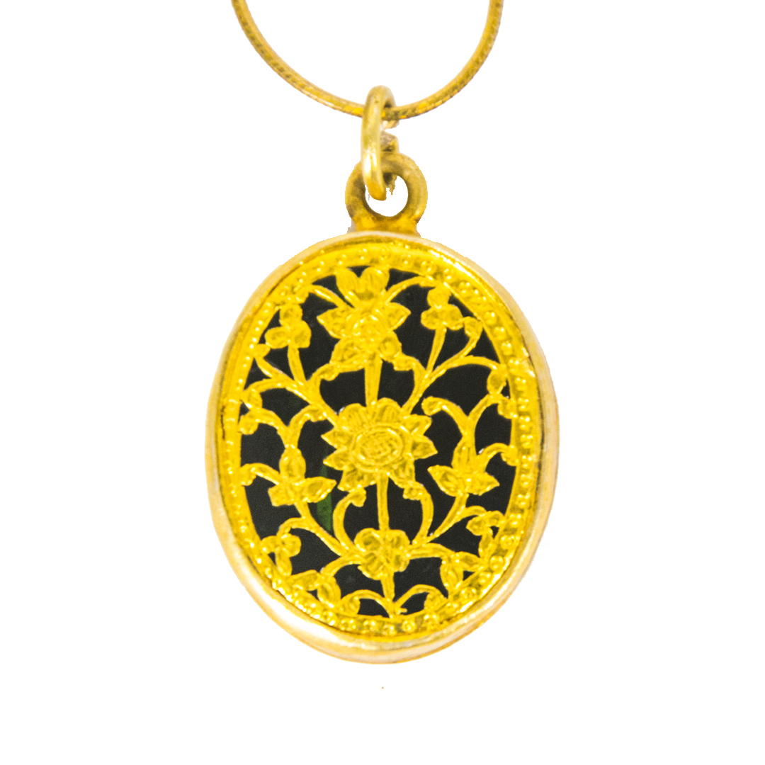 Thewa jewellery Pandent in 23 K Gold Foil carved with hands , fused with glass, framed in silver case gold plated.silver Hook Chain .Looks magnificent as a wedding gift.