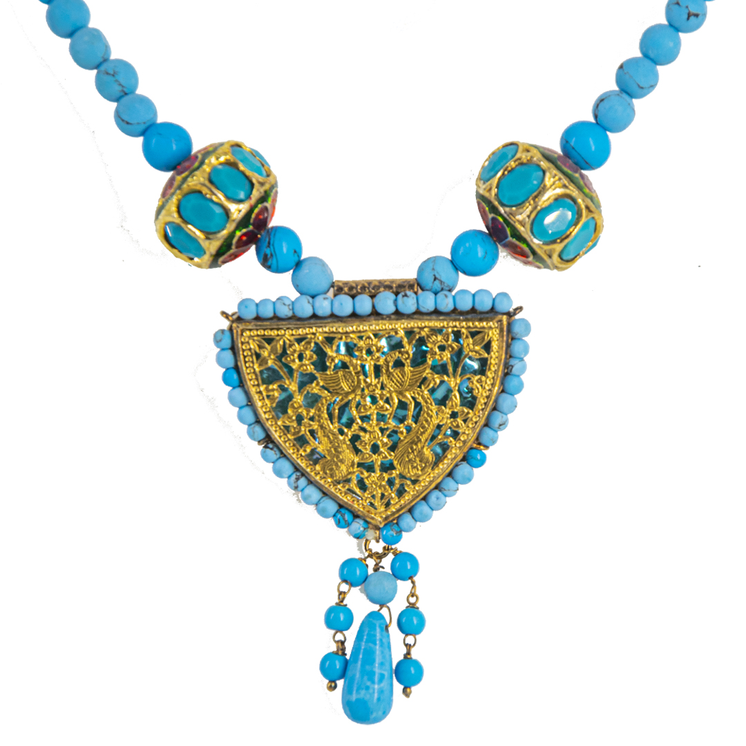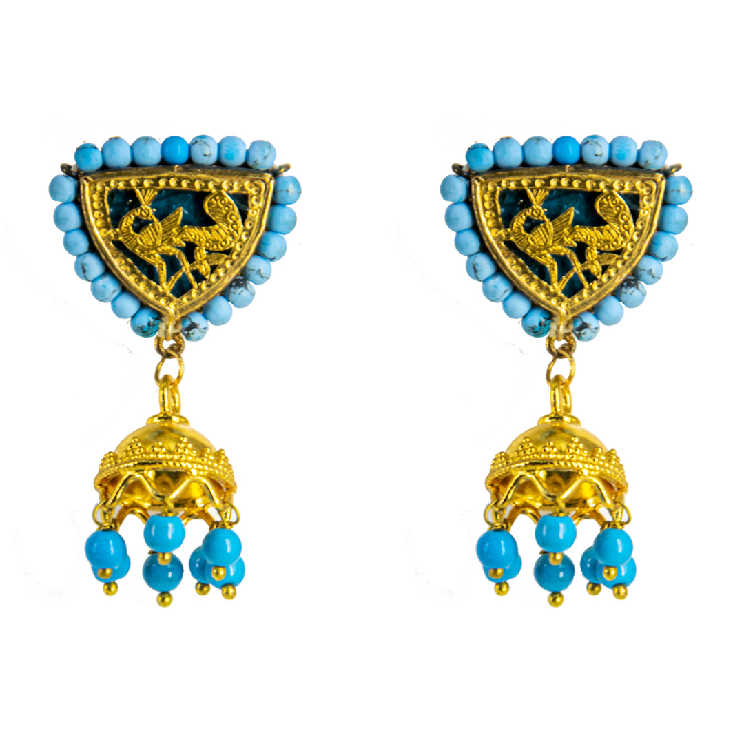 Thewa jewellery, 23 K Gold Thewa carved with hands, framed in pure 925 silver case, with 3 micron thick, gold plating. Real thewa in centre beading with Firoza gemstone and pure silver Jhoomkas. Looks magnificent as a wedding wear, contemporary outfit also.