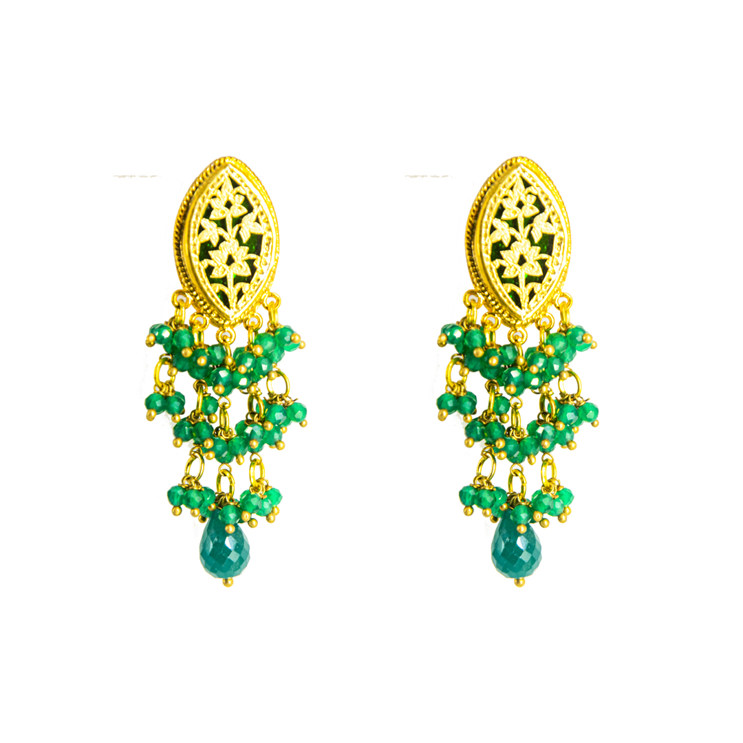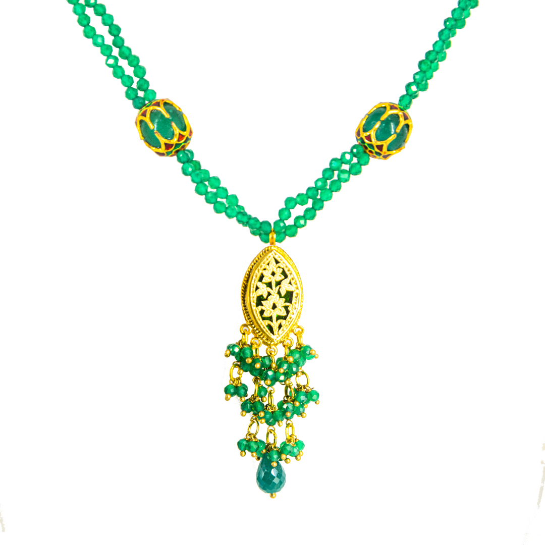 Thewa jewellery, 23 K Gold Thewa carved with hands, framed in pure 925 silver case, with 3 micron thick, gold plating. Real thewa in centre beading with real gem stones, Green Onyx. Looks magnificent as a wedding wear, contemporary outfit also.