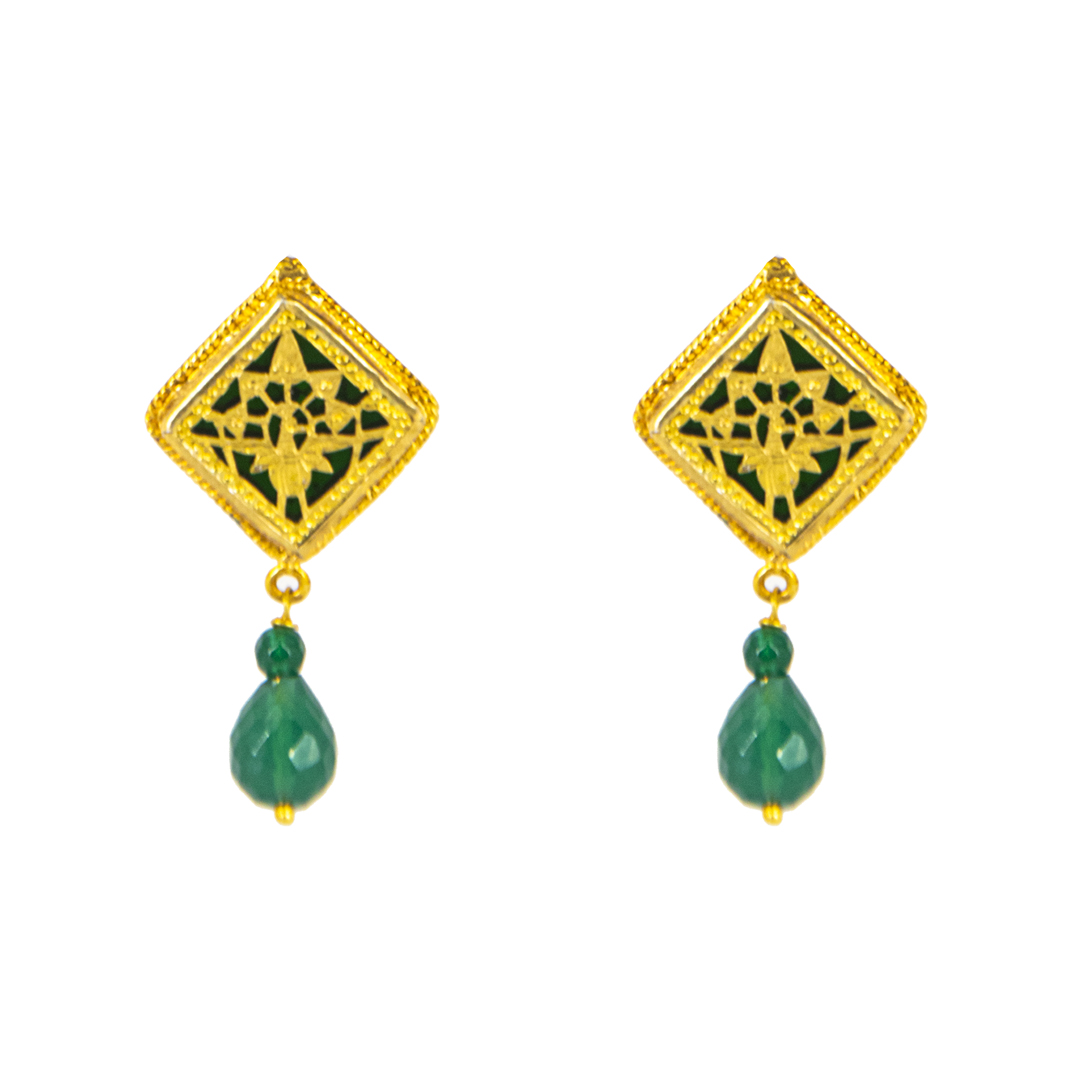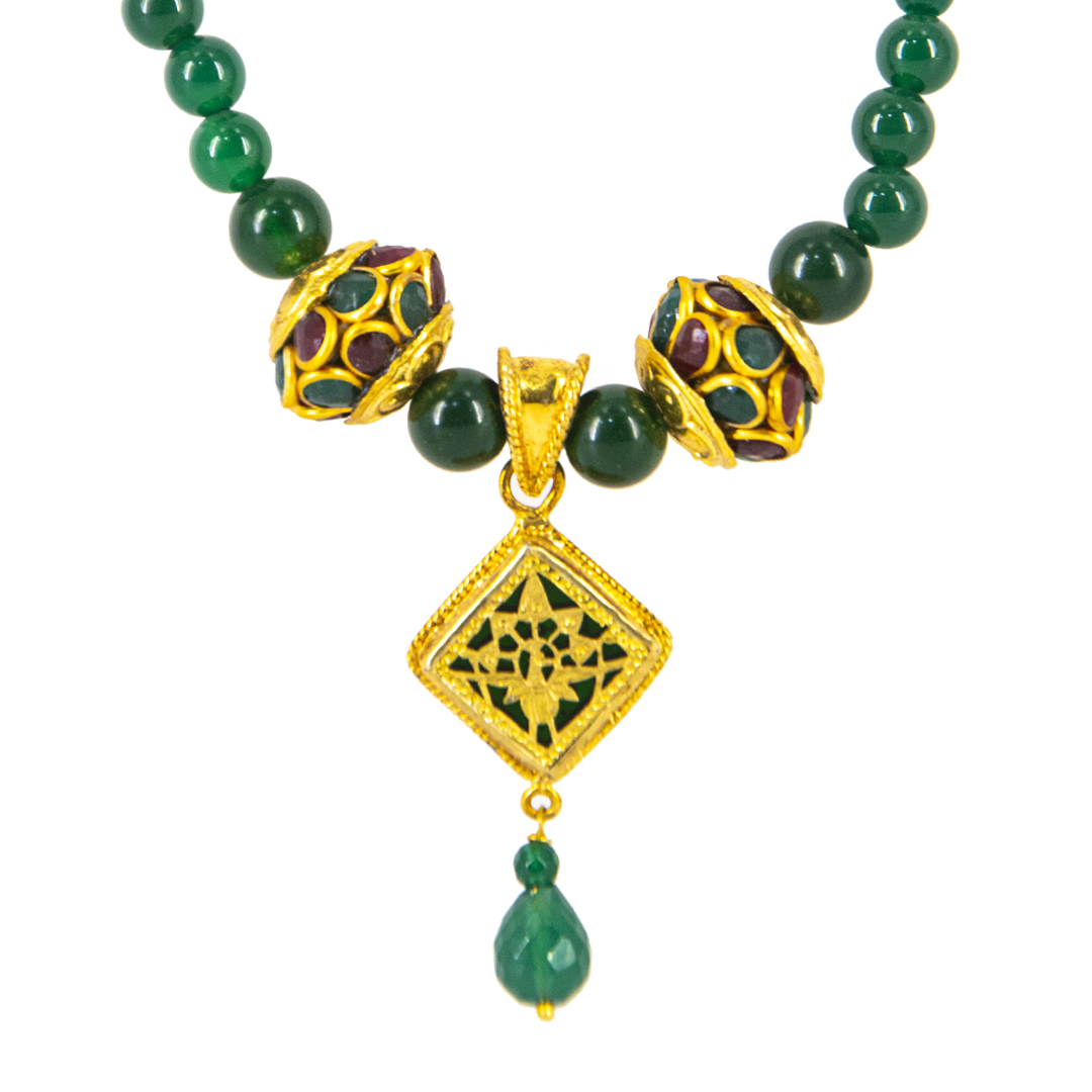 Thewa jewellery , 23 K Gold Thewa carved with hands , framed in pure 925 silver case, with 3 micron thick ,gold plating .Real thewa in centre beading with real gem stones, Green Onyx. Looks magnificent as a wedding wear, contemporary outfit also.
