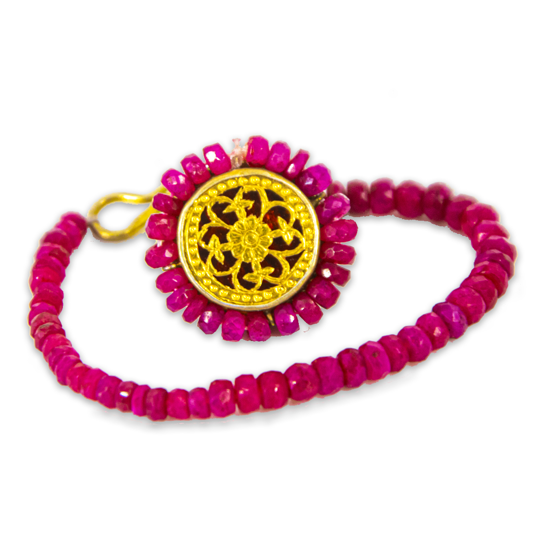 Thewa jewellery Borla / Rakhdi with 23 K Gold Thewa glass, carved with hands. Encased in pure silver gold plated .Real thewa in centre with Ruby Line .Looks magnificent as a ethnic wear.