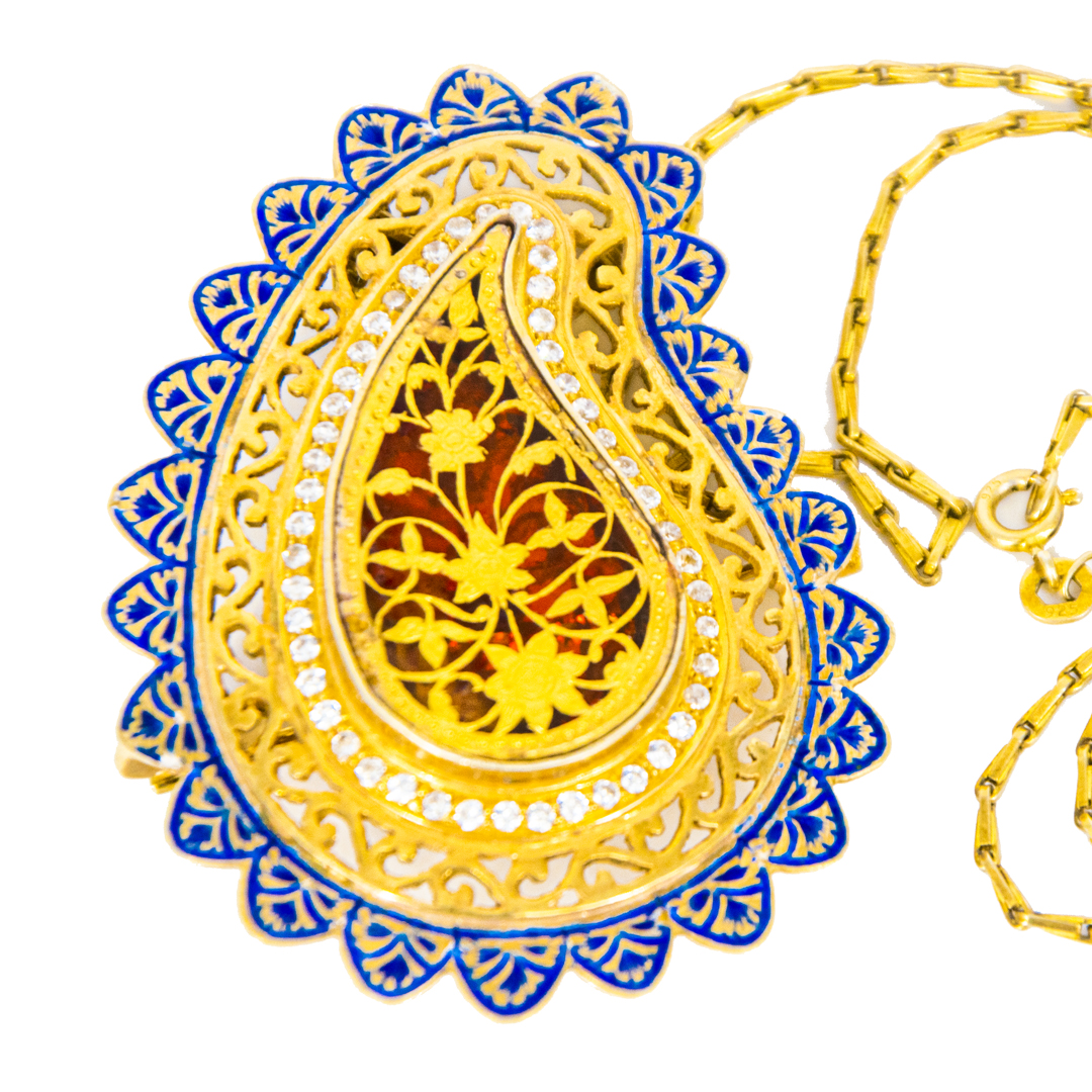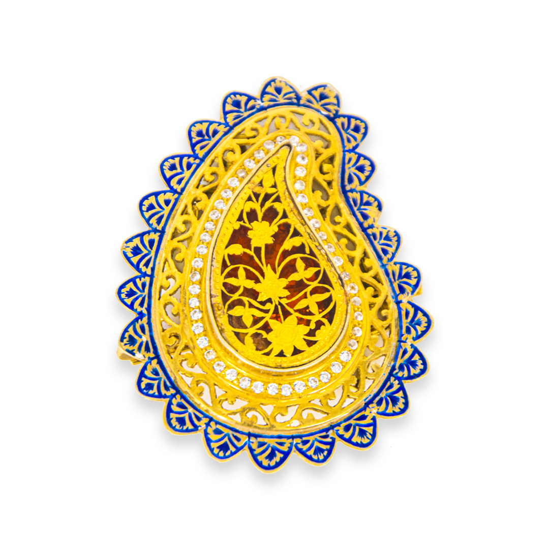 Thewa jewellery Pandant cum brooch, with 23 K Gold Thewa carved with hands in centre, encased in pure silver frame ,gold plated with meenalkari and Diamond outline on border, pure silver Hook Chain .Looks magnificent as a wedding wear, for both male and feamle use. Unisex article. Can be used as Brooch and Pendent both.