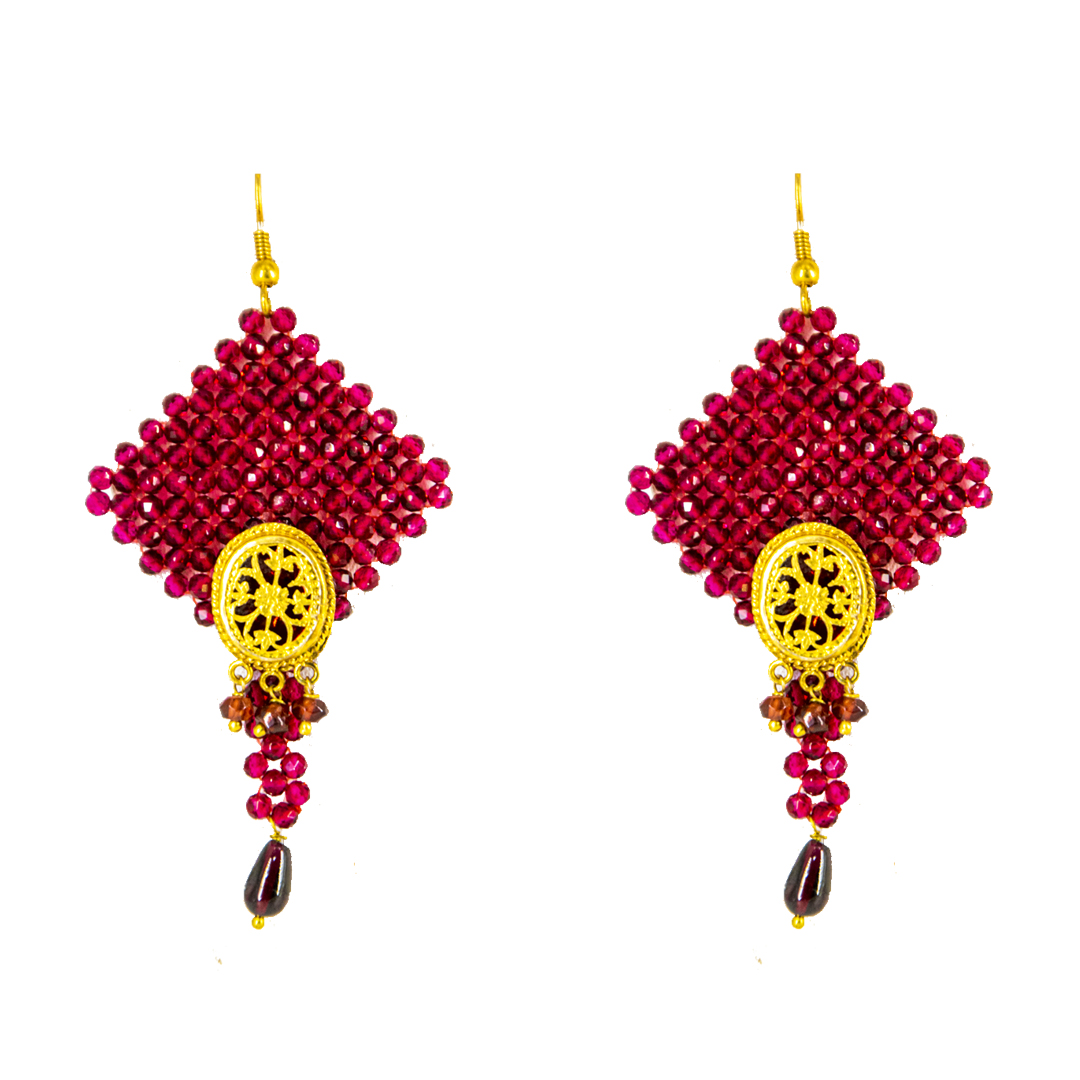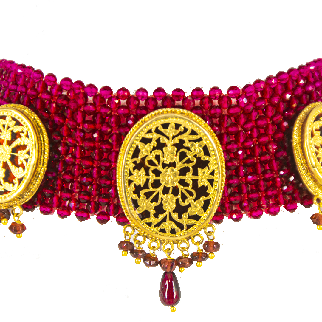 Thewa jewellery, 23 K Gold Thewa carved with hands, framed in pure 925 silver case, with 3 micron thick, gold plating .Real thewa in centre beading with Pure garnet gemstones. Looks magnificent as a wedding wear, contemporary outfit also.