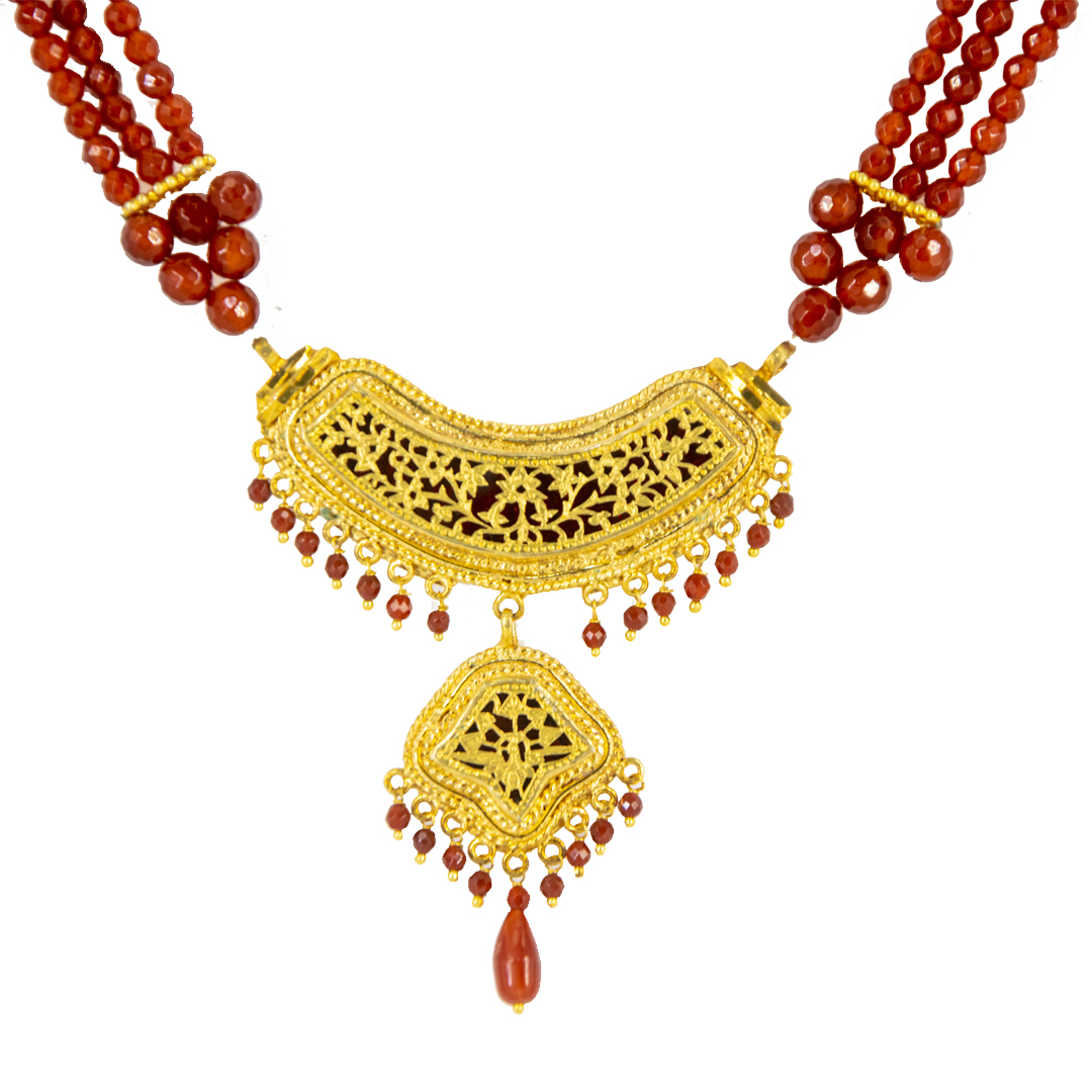 Thewa jewellery, 23 K Gold Thewa carved with hands, framed in pure 925 silver case, with 3 micron thick, gold plating. Real thewa in centre beading with real gem stones, Red Onyx. Looks magnificent as a wedding wear, contemporary outfit also.