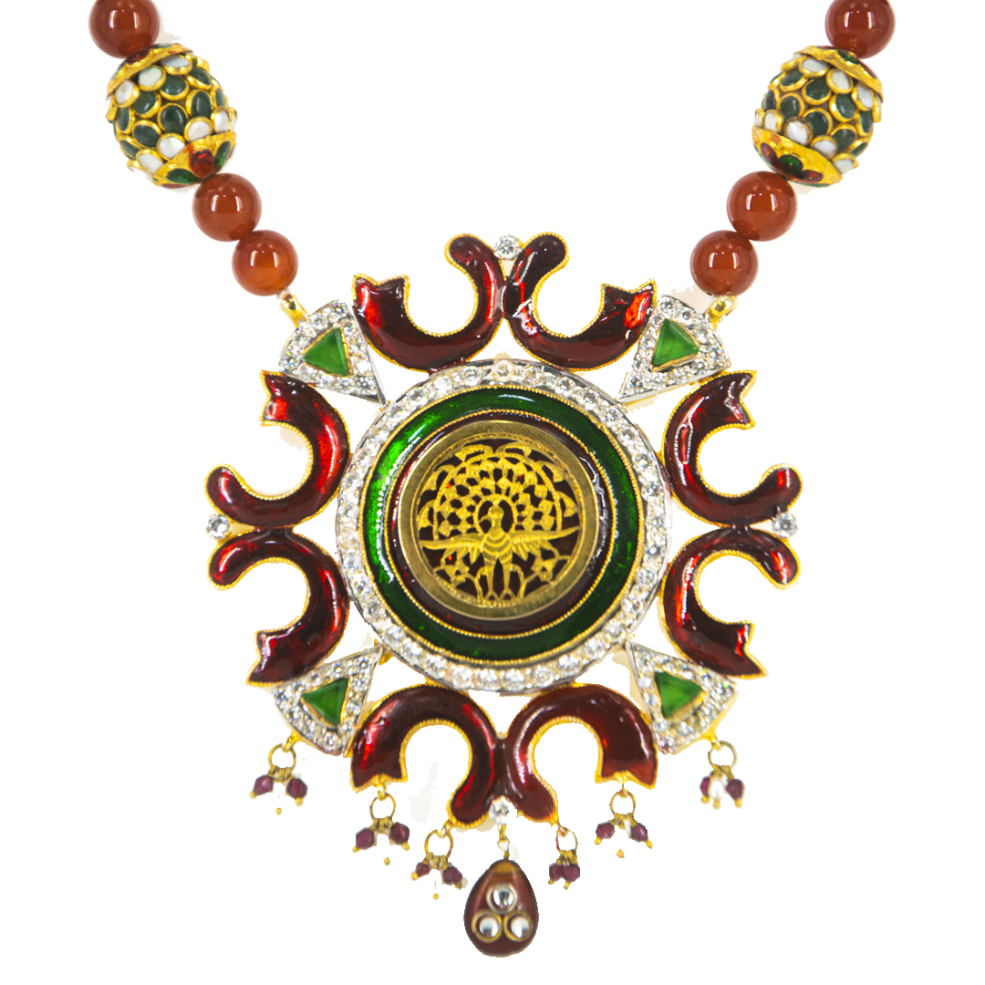 Thewa jewellery, 23 K Gold Thewa carved with hands , framed in pure 925 silver case, with 3 micron thick, gold plating. Real thewa in centre beading with real gem stones, American diamonds and meenakari on borders. Looks magnificent as a wedding wear, contemporary outfit also.