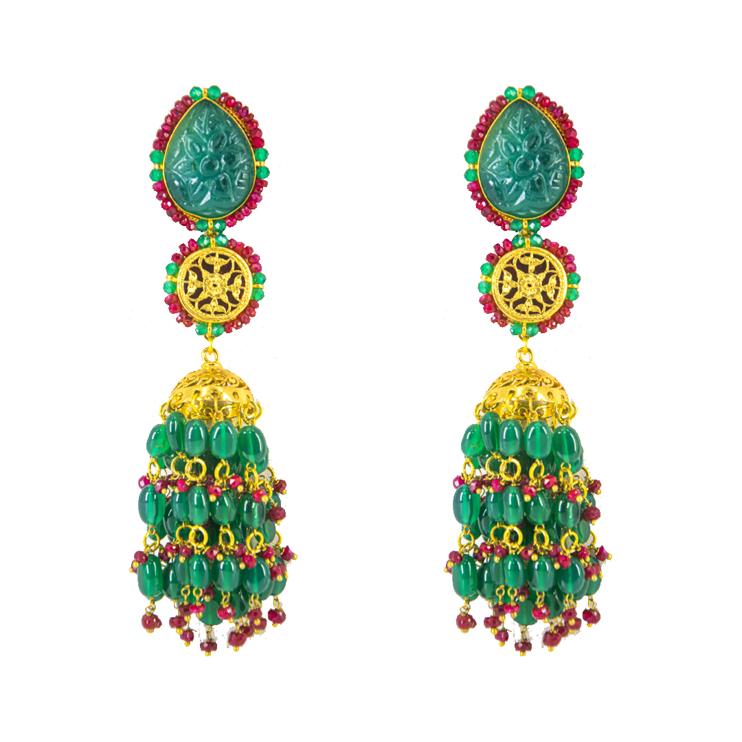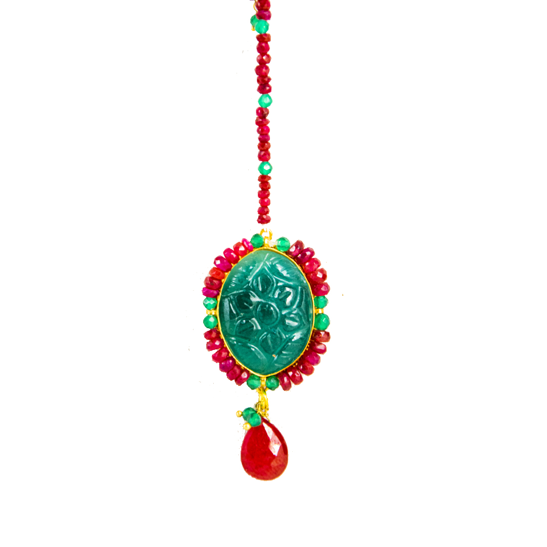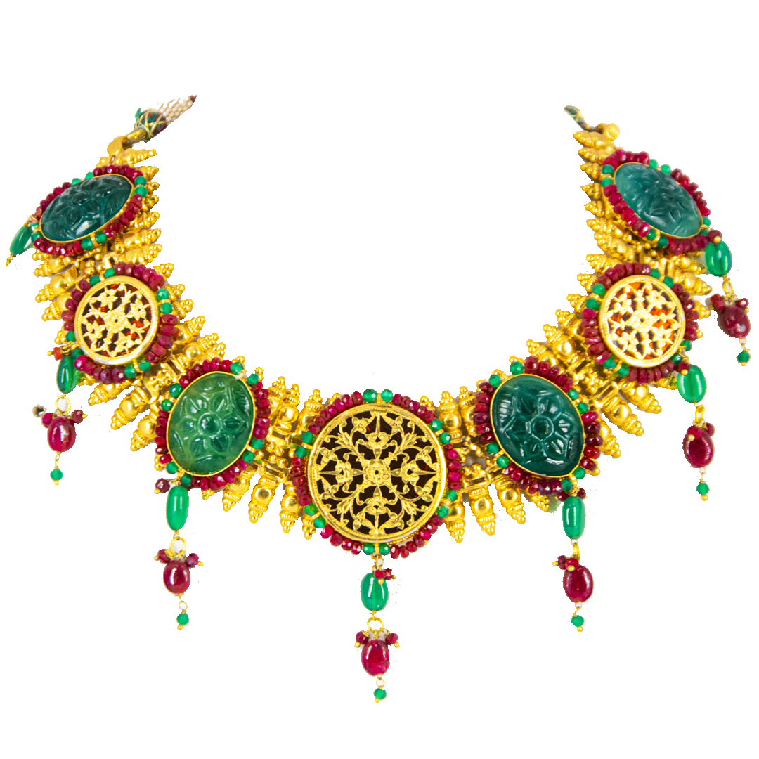 Thewa jewellery, 23 K Gold Thewa carved with hands, framed in pure 925 silver case, with 3 micron thick, gold plating. Real thewa in centre and Full Chain Back in real 925 silver work, alternating with handcarved onyx stones. Looks magnificent as a wedding wear, contemporary outfit also.